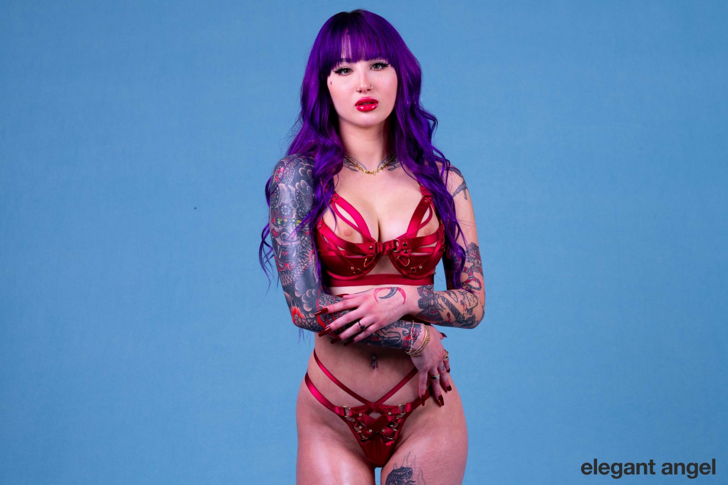 Inked Purple Haired Girl Valerica Steele In Red Lingerie And Black High Heels
